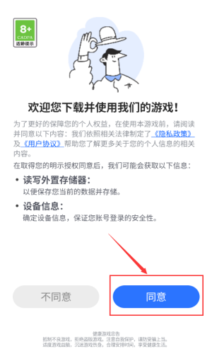 1、点击蓝色同意按钮,确认隐私政策开始游戏。
