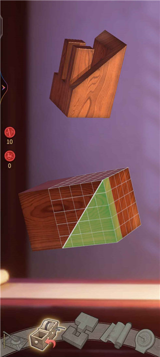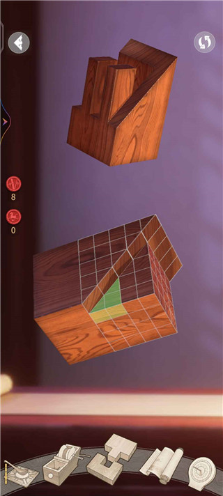 5.游戏将需要消减的物件分成了小方块,我们只需点击一格便能选中,手指进行滑动则能选中一块区域。这时我们点击一下选中区域,该区域则会消除,而点击空白处则能取消选中。在游戏过程中我们正是靠着一次次精准的消除区域,来达到榫与卯的绝对吻合。在过程中我们遇到不解,也不要忘了移动物件再次进行观察哦~